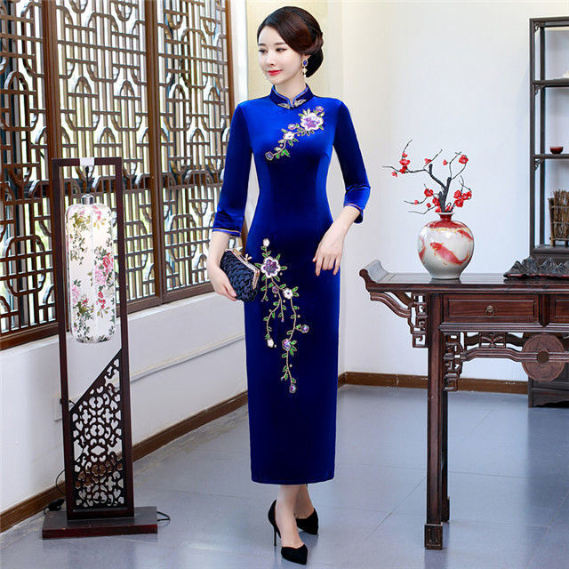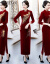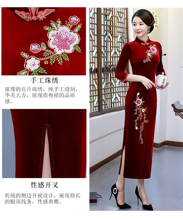 SORRYNAM秋冬お母さんの手縫いビーズ刺繍高級シルクの改良チャイナドレスの女性ローリングワンピースショーの結婚ドレスベンの赤い【珠繍02項】L