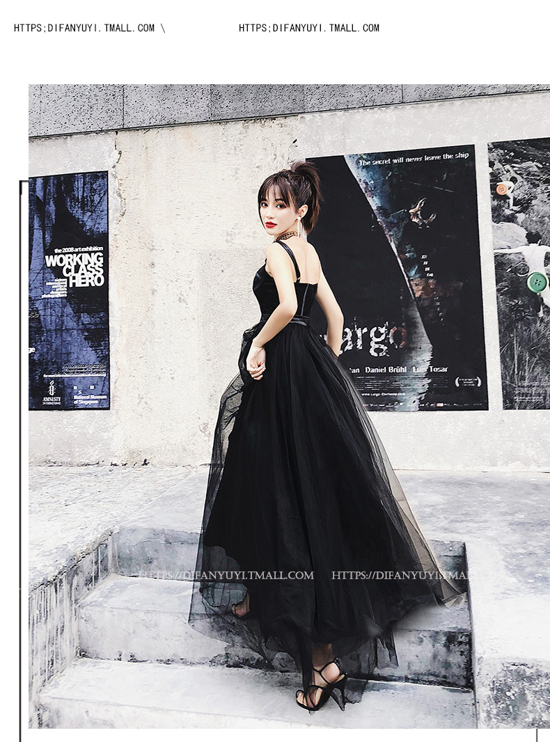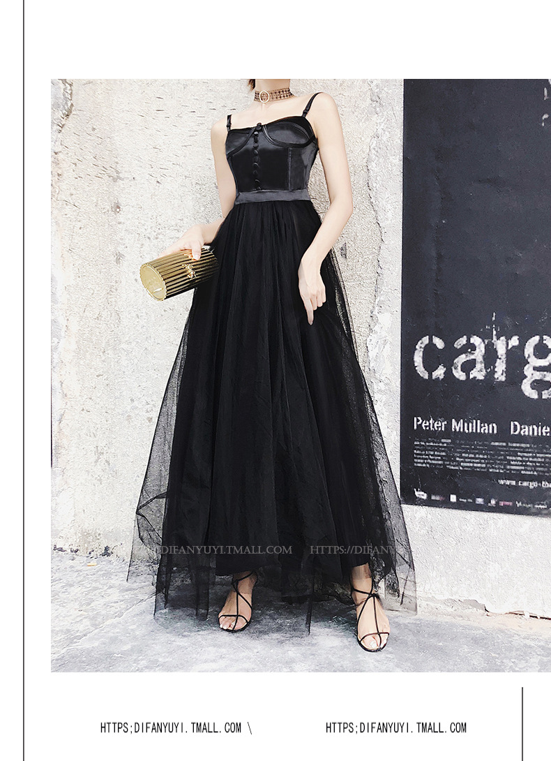 春の夏のブランドの直営黒いウェディングドレスの女性ロングール背もたれレイト端正で上品で上品な上级品ストラップ付きビスチェ宴会年会出演用ドレス黒ログキルL