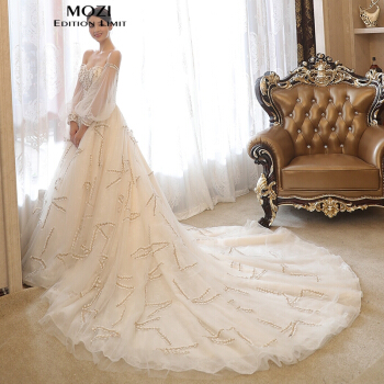 moziビスチェウェディング2019新型新婦の結婚洋風セクシーオフショルダーのトレイン上品シンプレム女史の結婚紗のドレスのシャンパン色トレイン