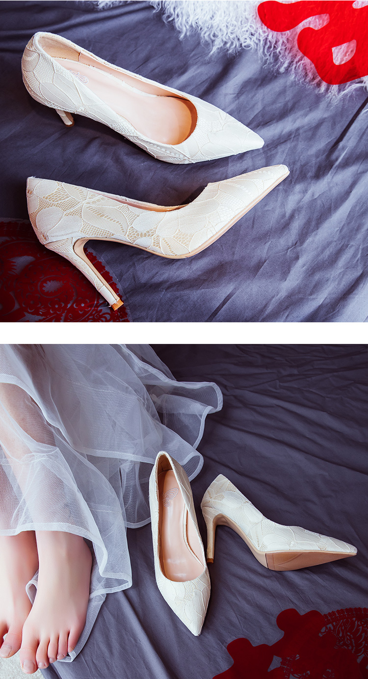 白の結婚靴の女性2018新型セクシーレスの新しい婦人靴の先のハイヒールの単品の靴は結婚してウェディングベールの靴の米白色(9.5 cm)の34