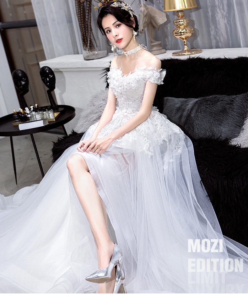 moziセクシーオフショルダーウェディング2019新型ショートドレールンコリアスレイ妊妇ナチルドレン上品昆凌同じスタル新婦ウェディングドレス短いトレインスタイルXL