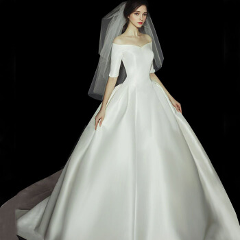 2018新型ナチルウエディングドレスシンプロの白いサテンのウェディングドレスウェディングドレスウェディングドレスウェルディ・ドレースの長袖短いドレン主のウェディングドレスの秋と白のトレインの3点セットXL