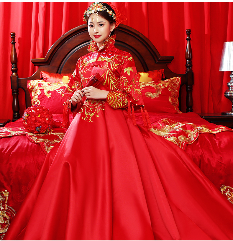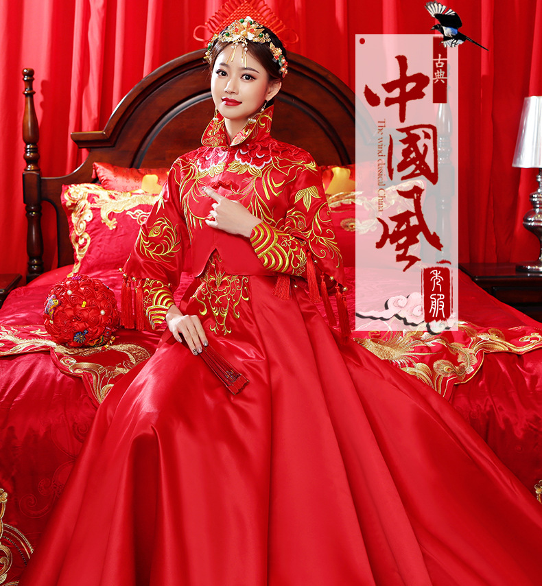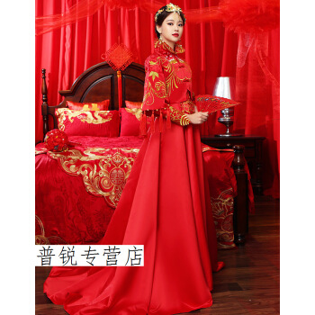 【春夏上新】新婦2018新款龍鳳服結婚服乾杯時間用ドレスアップ時代の結婚服の妊妇中華風ウェルディ・ドレース2点セット-ロングー版L