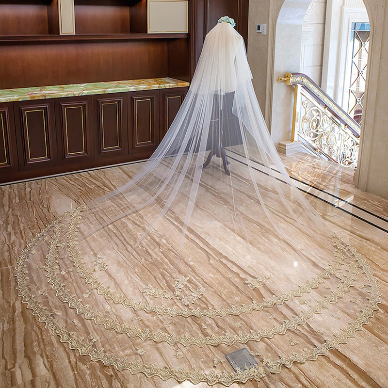 nuthink 2018新婦のシャンパン色のベールの頭飾りのウェディングベールふわわわわわの新型大レ-スコリアスタ超長のトレ-ル白の百合加颜隠す金のバルトフラワーの粘着穴158 cm以上