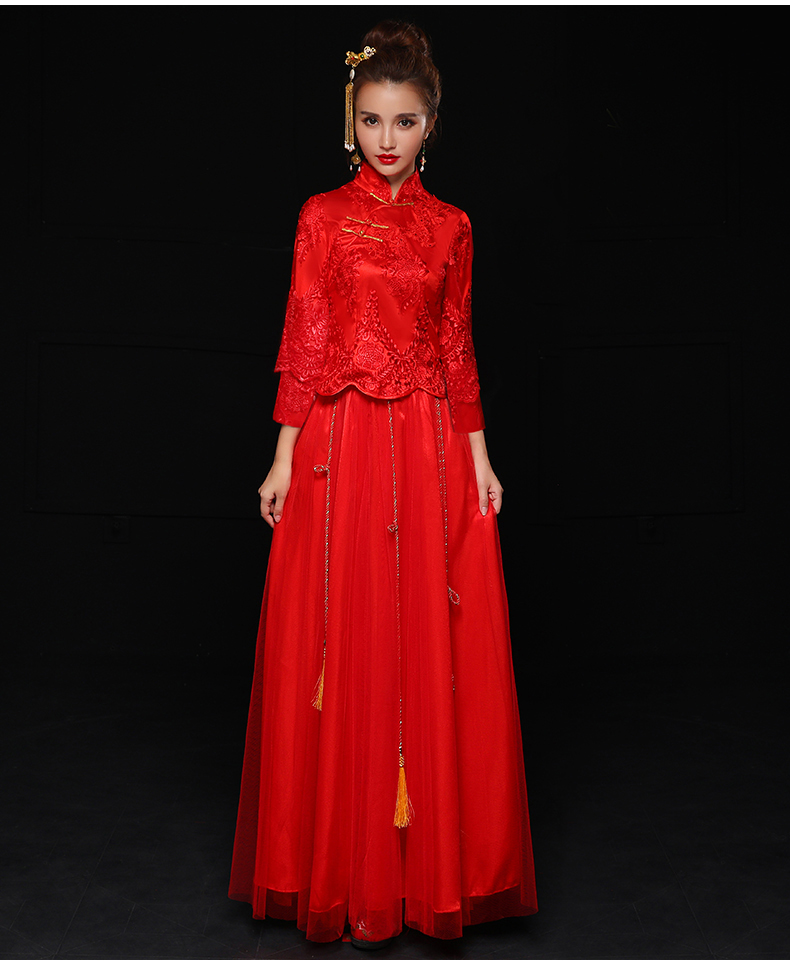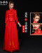 乾杯時間用ドレス新婦2018年春夏新款赤ロングール中華風ドレスレスネット結婚式ウェディングショー禾服大紅長袖+首飾りイヤリングM