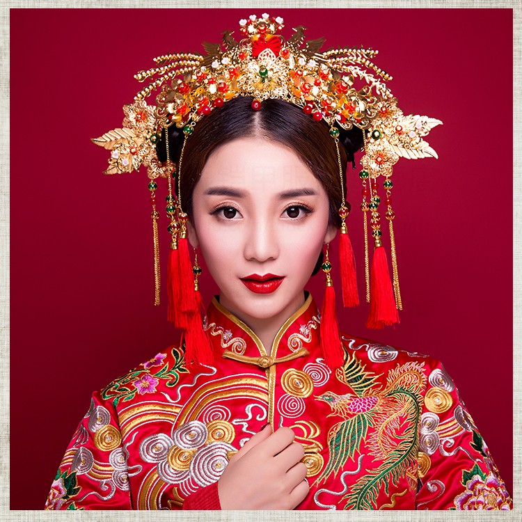 白銀の鎧の新婦の頭飾り中華風の赤いドレスアップショー禾服の敬酒ドレスアップの時代劇演出の影楼の結婚アクセサリーの頭花五点セットの平均サイズ